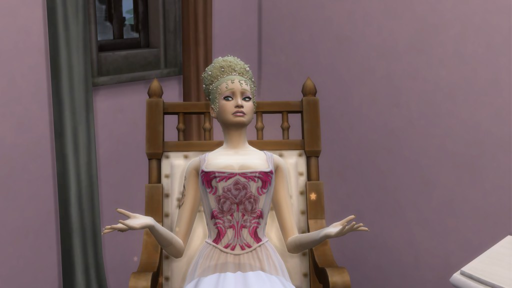 In its place sat a woman in a light pink gown embroidered with roses.