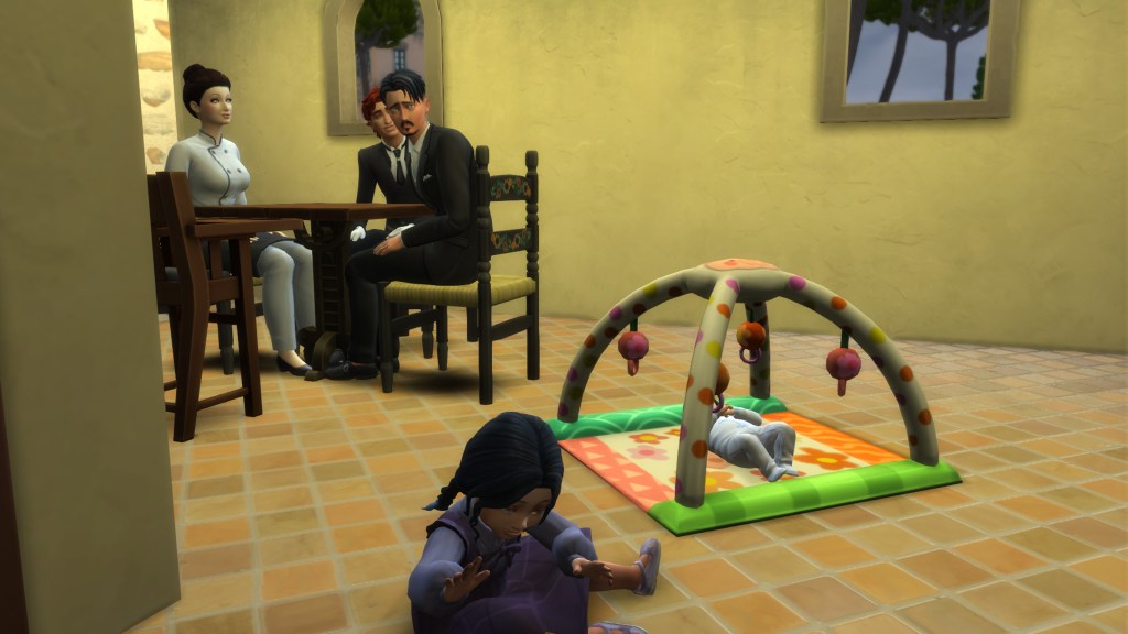 Behind him, Matilda scooped Jessica up from the playmat while Gia began rebuilding her fallen tower.