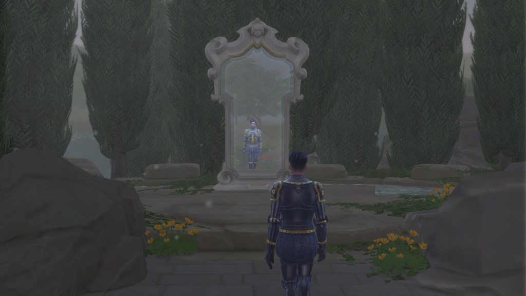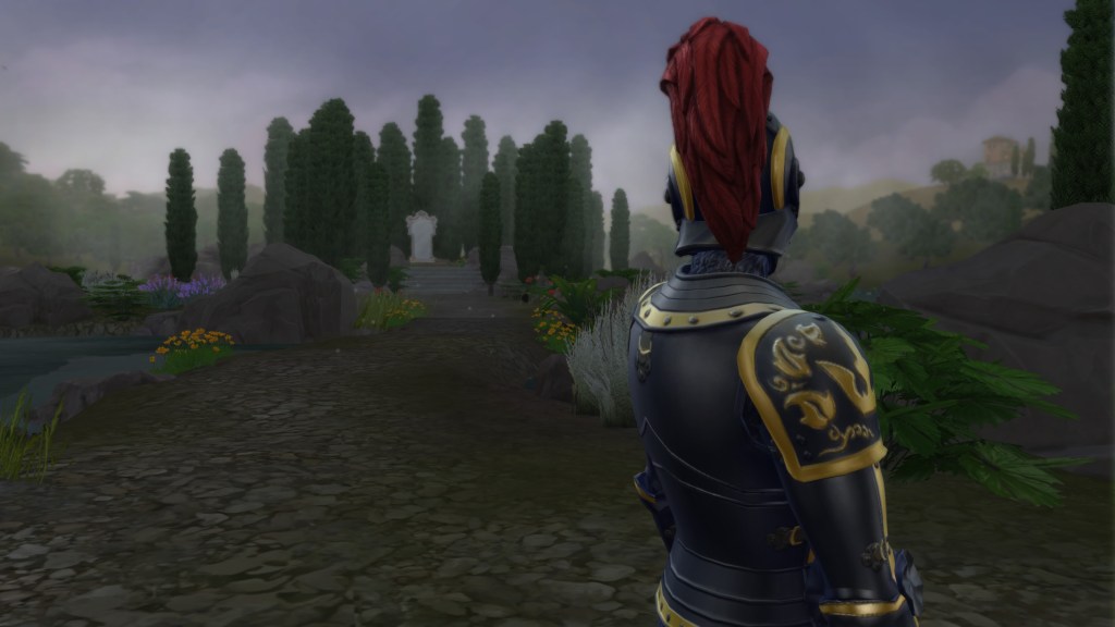 The mist still clung to the ground in thin ribbons, curling between stones and wildflowers as the path wound through a small grove of tall cypress trees. The world had grown quiet here, the sounds of the town fading behind him until only the rustle of leaves and the distant trickle of water remained.